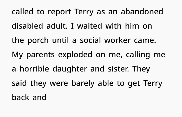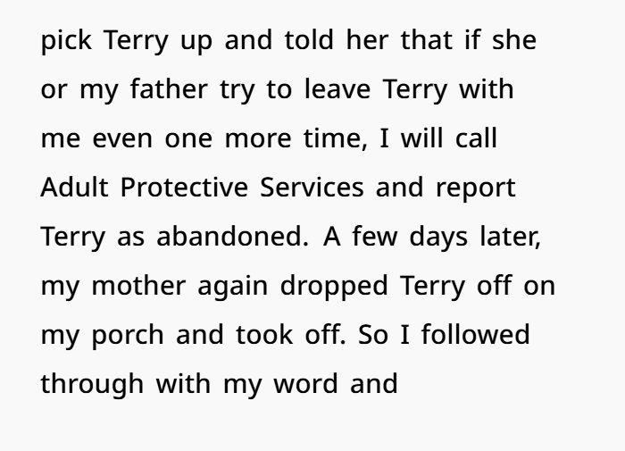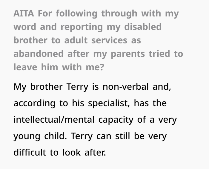 In your story, you’ve been dealing with a really heavy situation: caring for your brother, Terry, who is non‑verbal and has the intellectual/mental capacity of a very young child. Your parents have pushed you into a caregiver role since you were around 13—until you’re an adult—and you’ve made it clear you don’t accept that responsibility anymore. They continued to force drop‑offs of Terry at your place, ignoring your boundaries, cancelling your plans and disrupting your life. You finally warned them one more time: if they left Terry with you again, you’d call adult services and report the abandonment. They did it again. You followed through and reported the abandonment to adult protective services. They (and others) are now accusing you of being selfish and neglectful—though you acted because you were being unfairly burdened and your brother’s needs weren’t being properly met by your parents.