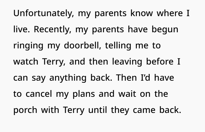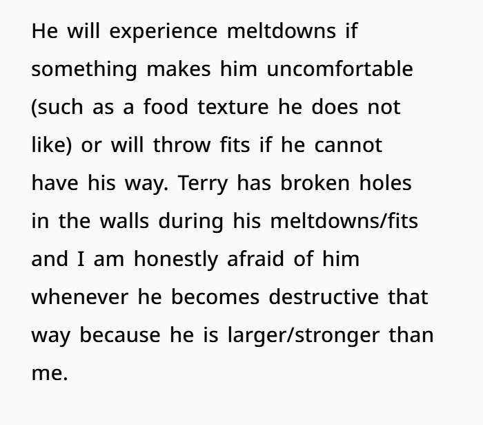 - Your parents’ role: They are Terry’s primary caregivers, presumably the ones responsible for making sure his needs are met, or arranging appropriate support. If they repeatedly dump Terry with you (knowing you don’t agree) they are outsourcing responsibility without your consent and without proper planning. That creates risk – for your life (you are afraid when Terry has meltdowns), for his safety, for his care, for your employment and freedom.