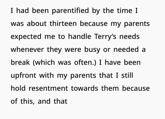 - You’ve told your parents you still hold resentment because you were forced into that role. That’s entirely fair—kids should not be primary caregivers for adult siblings in most cases, especially when the needs are substantial (meltdowns, destructive behaviour).