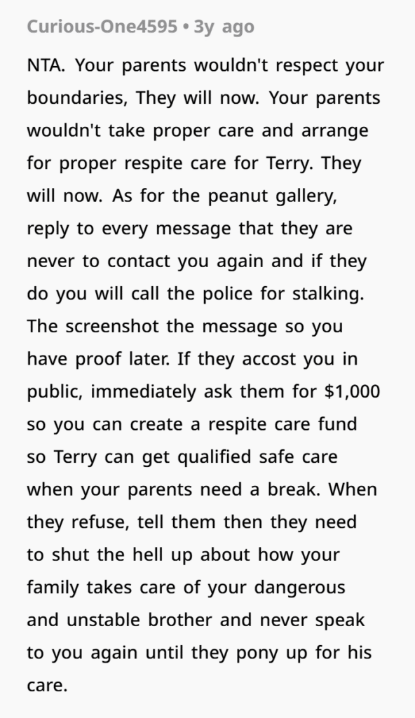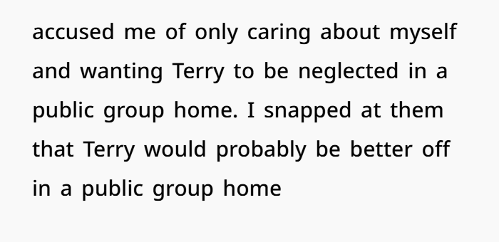 - “Now he might end up in a group‑home you don’t like.”: That’s possible, but that outcome is on your parents for not arranging care. The worst scenario would have been you burning out, things going really wrong for you and for Terry because of lack of supports. The goal is for Terry to have consistent, safe, appropriate care. If that ends up being a group home, that might be better than being shuffled between unwilling hosts.