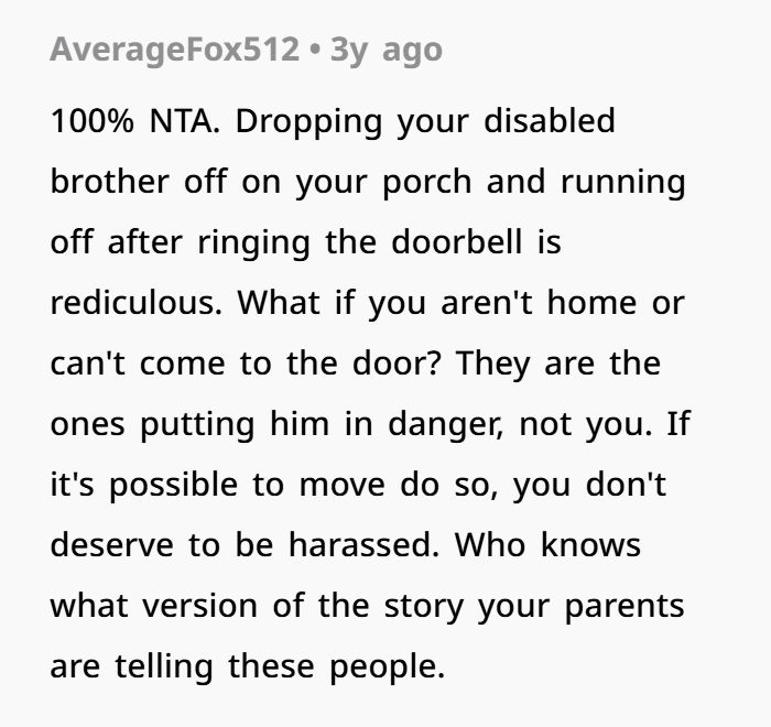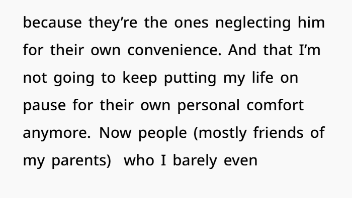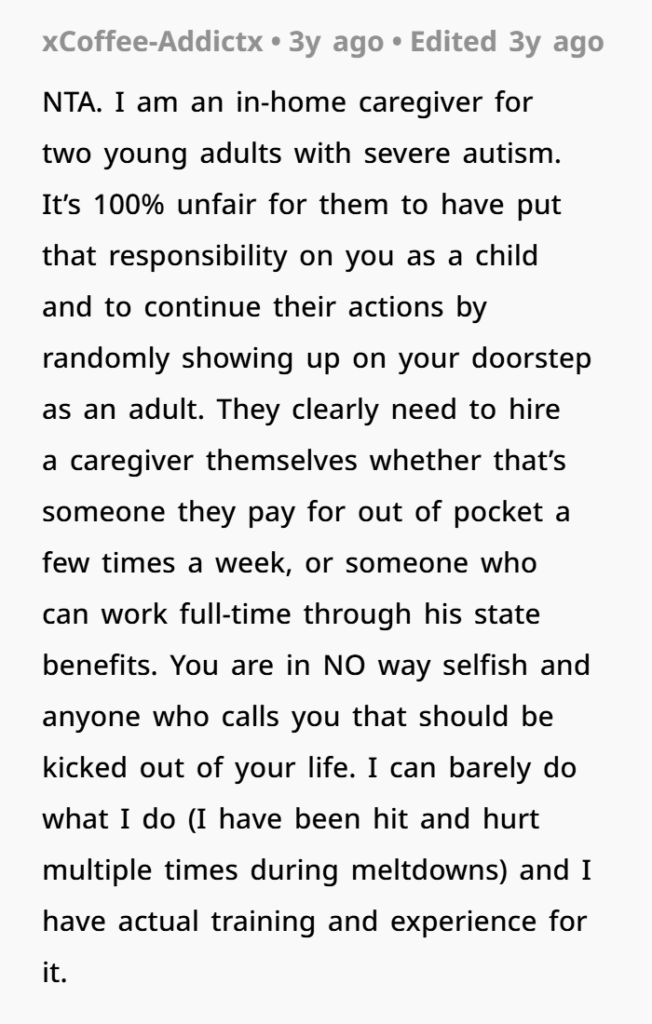 - “But you’re his sister—family should step up.”: True, family should help. But “help” doesn’t mean full‑time caregiving under duress, especially if you didn’t sign up for it, if you have your own life and job, and if you were coerced into it as a teenager. You can help in a way that works for you, but being the default caregiver isn’t the only option.