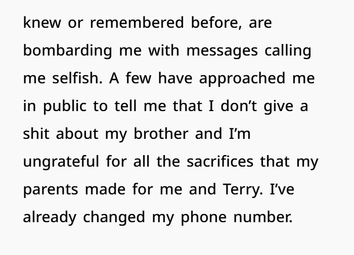 - “You ruined the family.”: The family dynamic was already damaged by your parentification and your resentment. You withdrawing from that role is maybe the healthiest thing for you. You can still love your brother; you’re just refusing the caregiver mantle no longer fits.