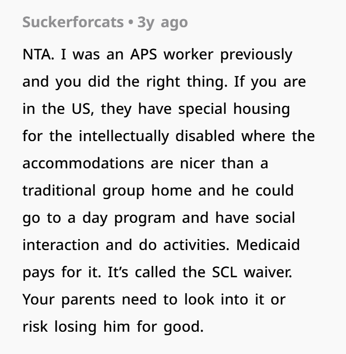 - Terry’s welfare: By calling APS you sought professional intervention, which could lead to a more stable arrangement or proper service plan for him. You are not abandoning him—you are demanding the proper responsible parties step up. That’s the responsible path.
