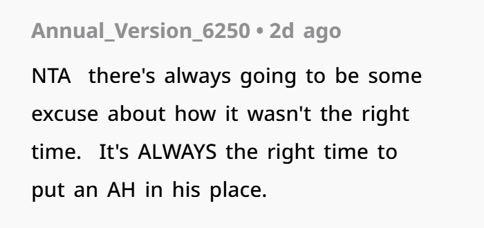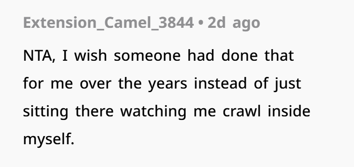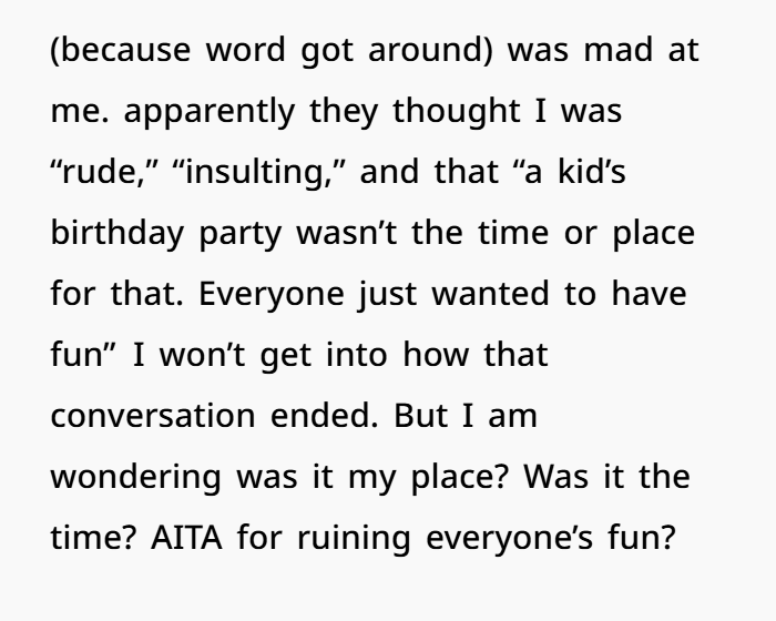So no, OP. You’re NTA. You didn’t ruin the party — you just interrupted the toxic pattern that everyone else was content to ignore.