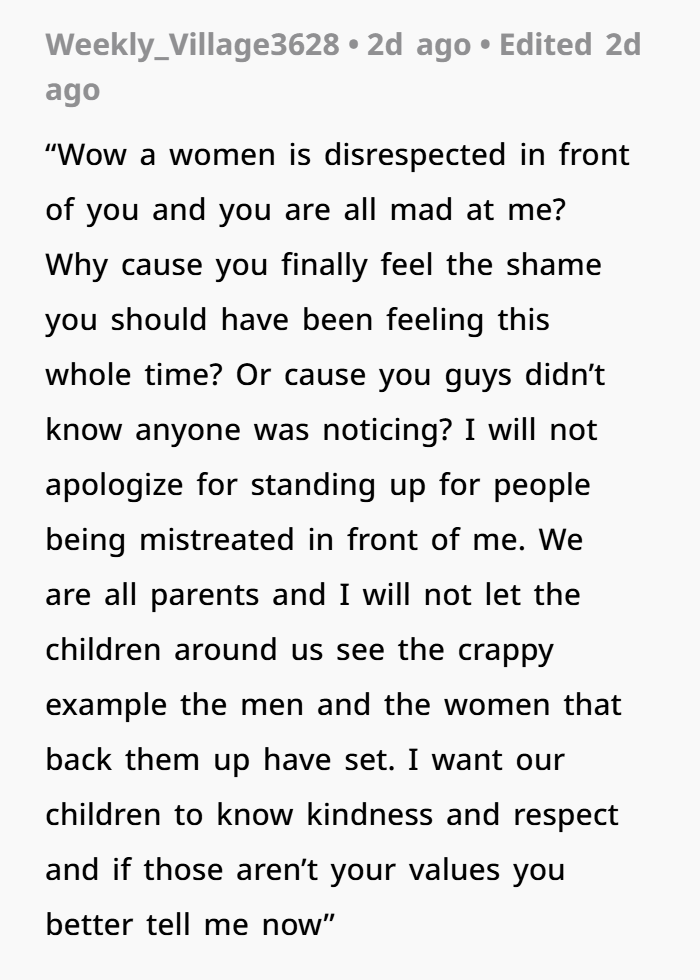 This is one of those moments where what you do teaches more than what you say. OP might have made some people uncomfortable, sure. But she also modeled something powerful — that respect matters, and silence is not always the right answer.