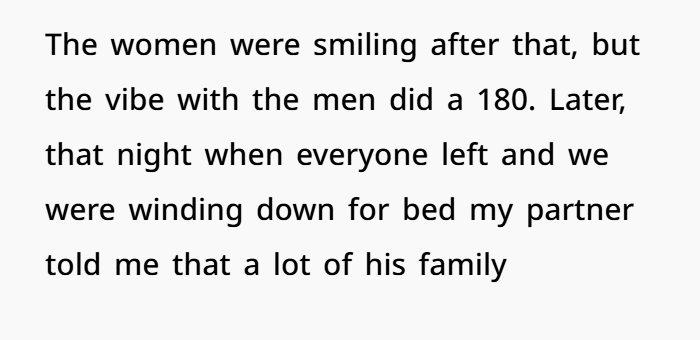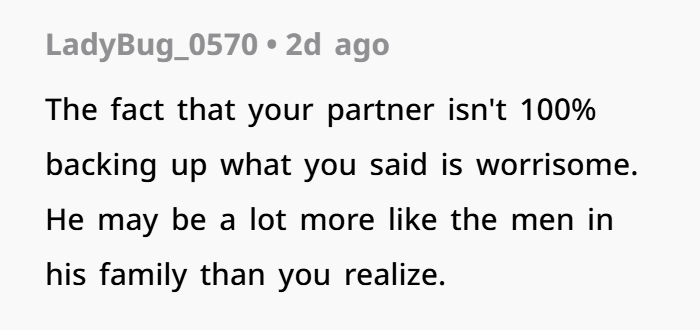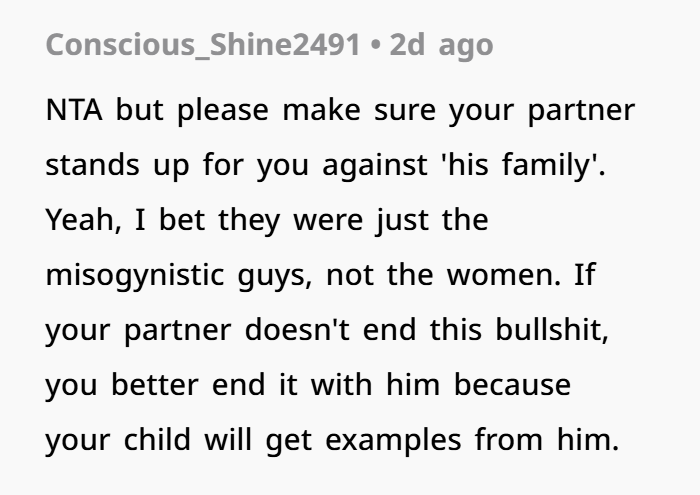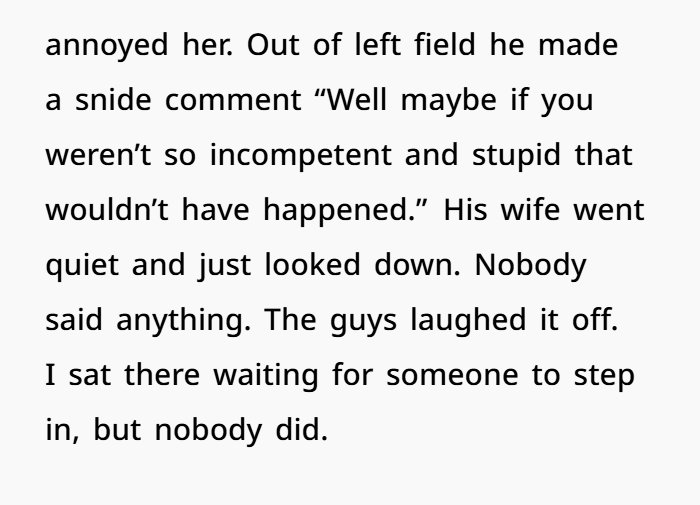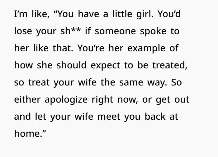 Fed up with the toxic behavior and silence from the rest of the room, she called him out. Calm but firm. She reminded him he has a daughter — and how he treats his wife is what his little girl will think is normal. Her line was clear: apologize or leave. He apologized. But even though the women in the room smiled and seemed grateful, the men flipped the mood. Later that night, OP’s partner said the family was mad at her. Called her “rude” and said it was the wrong time and place. Now she’s wondering: Was I really the AH for speaking up? Or was it about time someone did?