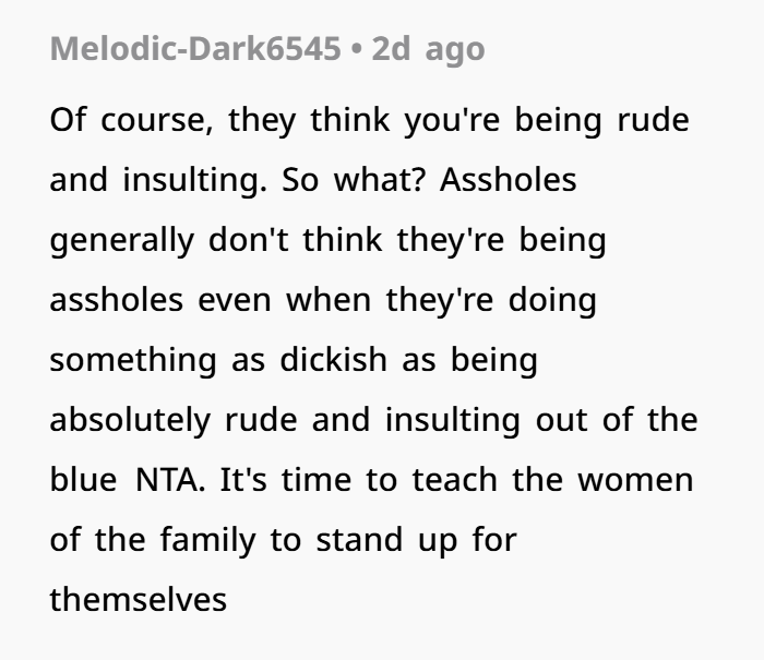 Netizens applauded the author standing up for the wife of the cousin amidst a seemingly misogynistic family