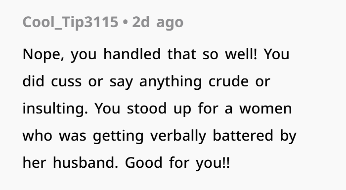Even worse? Kids pick up on this stuff fast. Studies from the American Psychological Association show that children exposed to verbal aggression at home are more likely to develop anxiety, depression, and even repeat the behavior in their own relationships. So OP wasn’t just defending the wife — she was making a statement in front of every kid in the house.