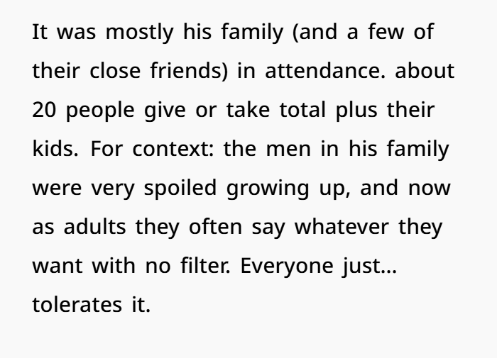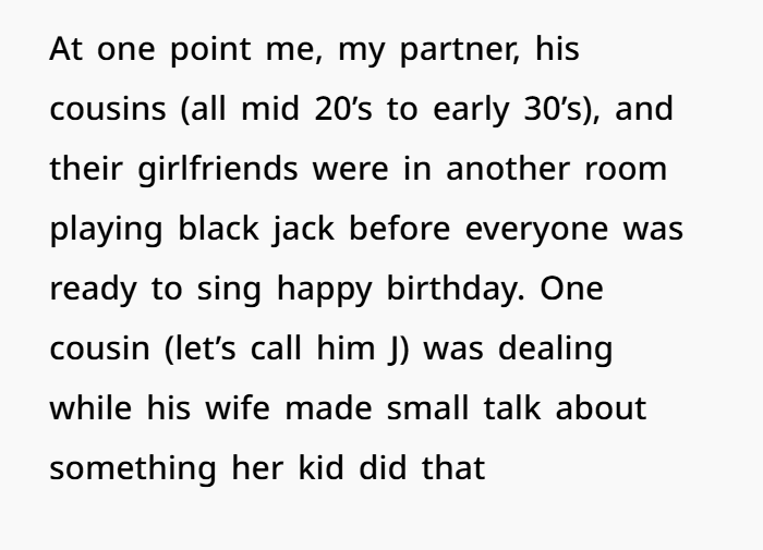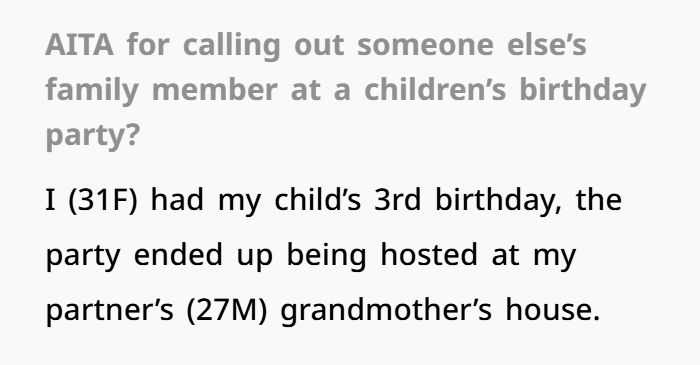 OP (31F) found herself in a tricky situation during her 3-year-old’s birthday party. The event was hosted at her partner’s grandmother’s house and was mostly filled with his family — people she’s still getting used to. What was supposed to be a fun, family-centered celebration took a sharp turn when one of her partner’s cousins, “J,” made a nasty, demeaning comment to his own wife. In front of everyone. Loud and unfiltered. Something along the lines of calling her “stupid” and “incompetent” because their child had done something annoying. The room went quiet. The guys laughed. The wife looked down. And no one said a damn thing.