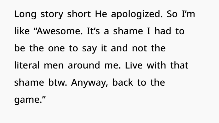 Also: It’s wild how often women are expected to be polite while handling situations that are already messed up. If OP had said nothing, people would’ve kept laughing it off. But because she said something — suddenly, it’s a scandal.