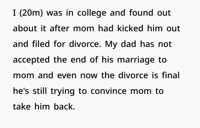 This situation hits hard because it’s not just about cheating—it’s about everything that came after. The OP, a 20-year-old college student, finds out his dad had an affair that resulted in a baby. By the time he learns the truth, his mom has already kicked the dad out and filed for divorce. Instead of accepting responsibility, the dad doubles down—refusing to let go, harassing the mom, and even showing up with the baby trying to “rebuild” the family like nothing happened. That alone pushes things from messy to outright painful.