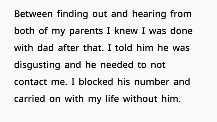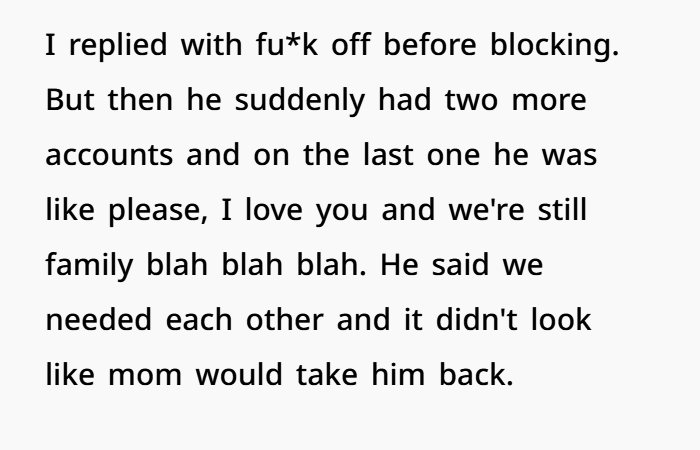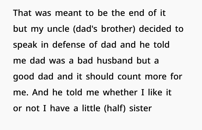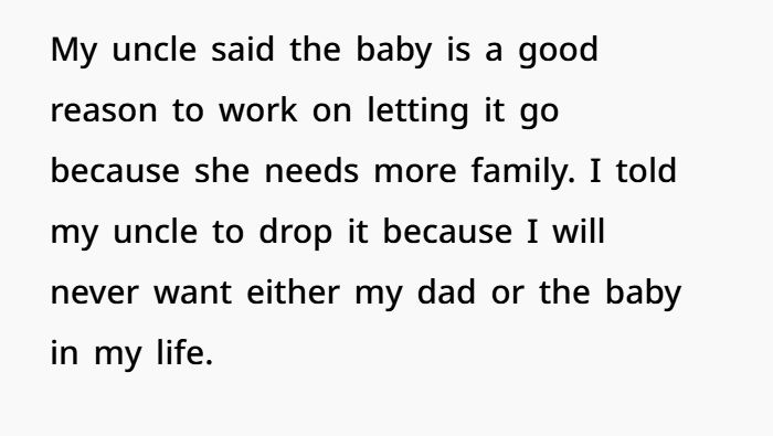 For OP, that was the breaking point. He cuts his dad off completely—blocks him, refuses contact, and mentally moves on. Even the existence of a half-sister doesn’t change anything for him. When his dad keeps trying to force communication, OP responds bluntly and shuts it down again. But the conflict doesn’t stop there—extended family steps in, especially an uncle who argues that the dad’s mistakes as a husband shouldn’t erase his role as a father. Now OP is stuck being painted as cold and immature… just for protecting his peace.