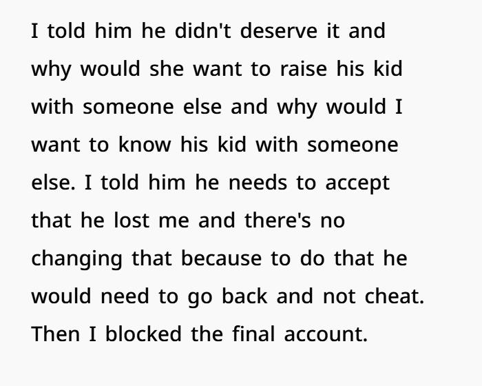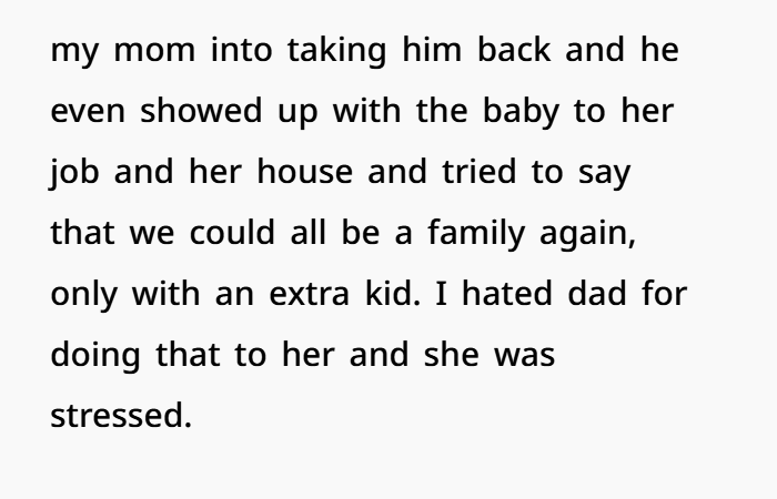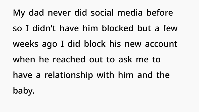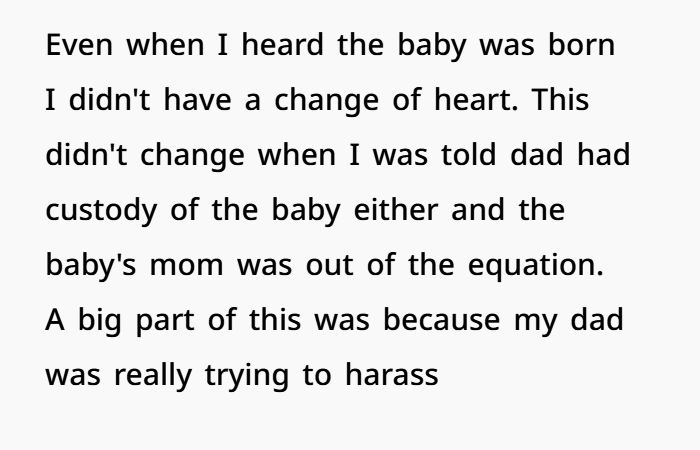 Then add the dad’s behavior after the truth came out. This part matters a lot. If he had owned up, respected boundaries, and tried to rebuild trust slowly, we’d be having a slightly different conversation. But instead, he harassed OP’s mom, showed up uninvited, and tried to force a fantasy where everyone just accepts the new reality—including the baby. That’s not remorse. That’s avoidance and denial.