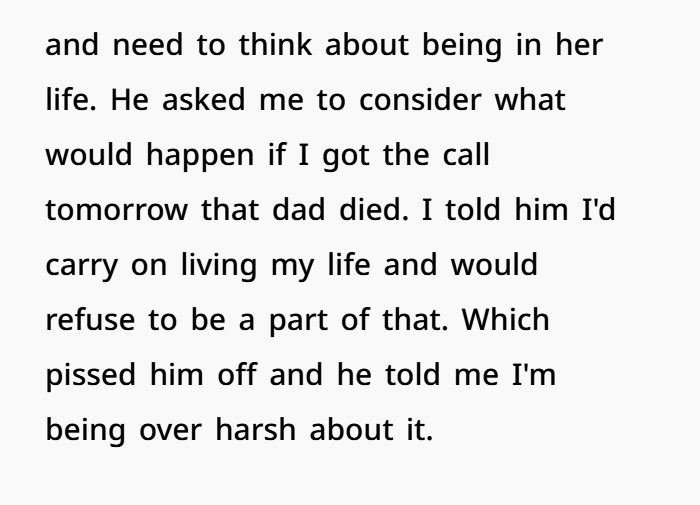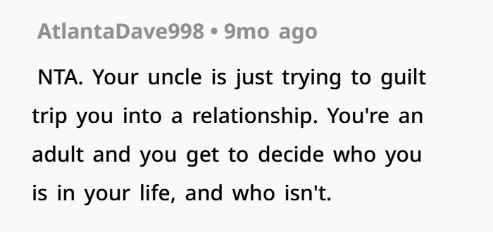 The uncle’s argument about “what if your dad died tomorrow” is also worth unpacking. This is a classic emotional pressure tactic. It tries to replace present-day reality with hypothetical guilt. But decisions about relationships should be based on current behavior and boundaries, not fear of future regret.