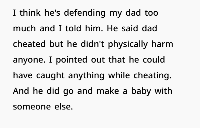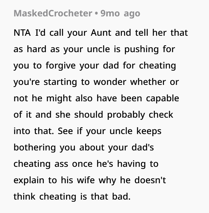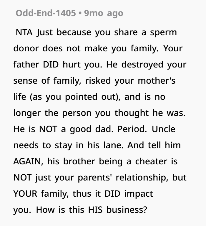 First, we need to separate two things people keep mixing together: being a bad partner vs being a bad parent. The uncle’s main argument is that OP’s dad was a “bad husband but a good dad.” On paper, that sounds like a fair distinction. In real life? It’s not that simple.