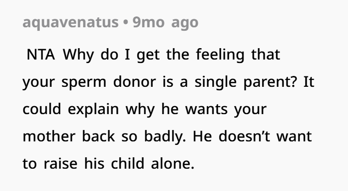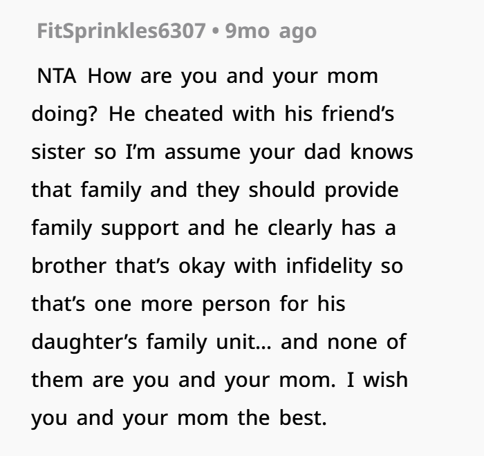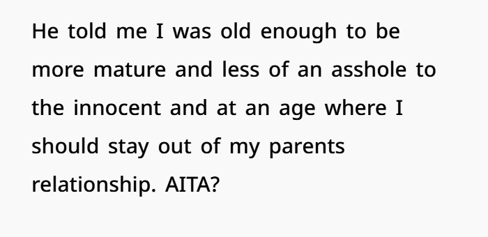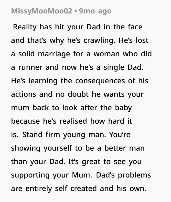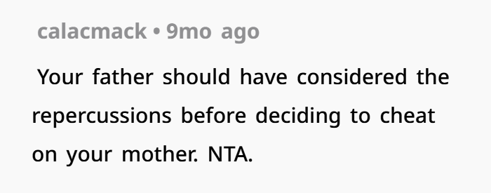 Another angle here is the idea that OP should “stay out of his parents’ relationship.” That sounds reasonable at first, but it ignores the fact that the dad’s actions directly affected OP. This wasn’t a quiet affair that stayed hidden. It exploded into his life, changed his family structure, and continues to impact his mom’s well-being. He’s already involved, whether he wants to be or not.