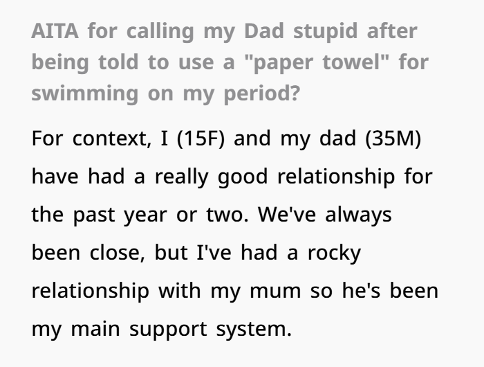 AITA for Calling My Dad Stupid After He Suggested Using a “Paper Towel” So I Could Swim on My Period?