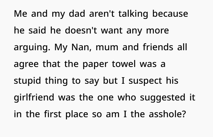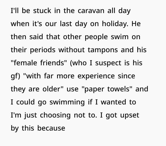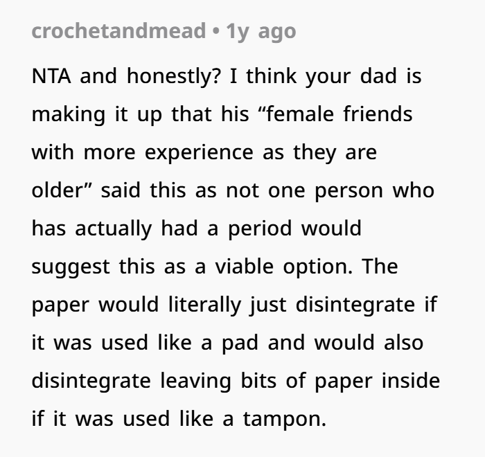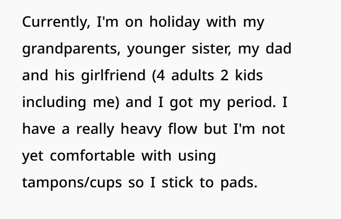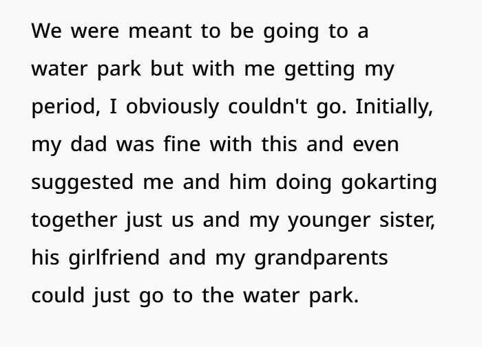 This post is a mix of frustration, misunderstanding, and a young woman just trying to deal with her period on a family holiday. OP, a 15-year-old girl, finds herself in an uncomfortable — and frankly, ridiculous — situation when her dad suggests she could just use a “paper towel” to go swimming during her period. What started as a supportive gesture (her dad offering to take her go-karting while the rest of the family went to a water park) quickly turned into an emotional slap when he changed his plans last minute and implied she was being difficult for not just “sucking it up.”