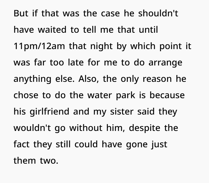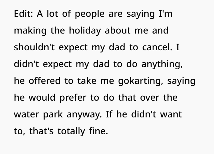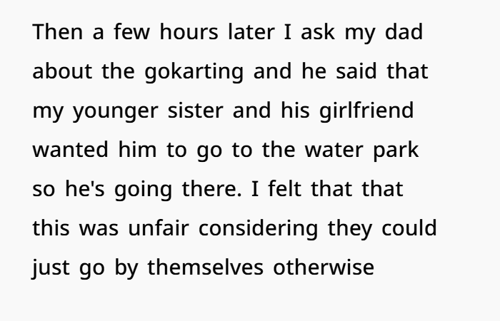 You were promised an alternative — go-karting. Your dad offered it. You didn’t ask. He brought it up because he knew you couldn’t join in the water activities, and it was a nice gesture. But then, when pressure came from his girlfriend and younger daughter, he chose them. Last-minute. At night. Too late for you to do anything else.