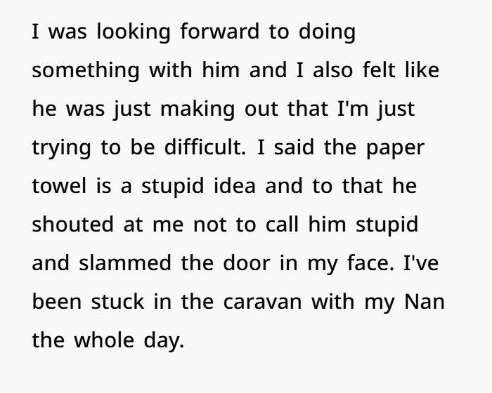 Her reaction? She called the idea stupid — and got the door slammed in her face. The fallout was a silent day stuck in a caravan while the rest of the family went off to have fun, leaving her alone and angry. So now she’s wondering — was it wrong to react that way? Was she just hormonal and lashing out? Or did her dad genuinely cross a line by invalidating her experience?