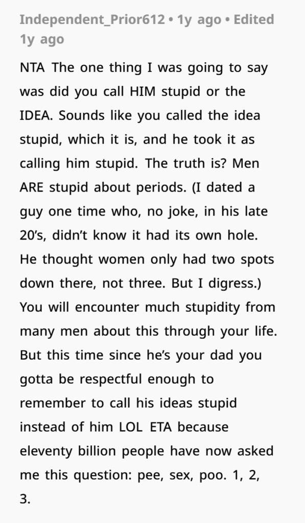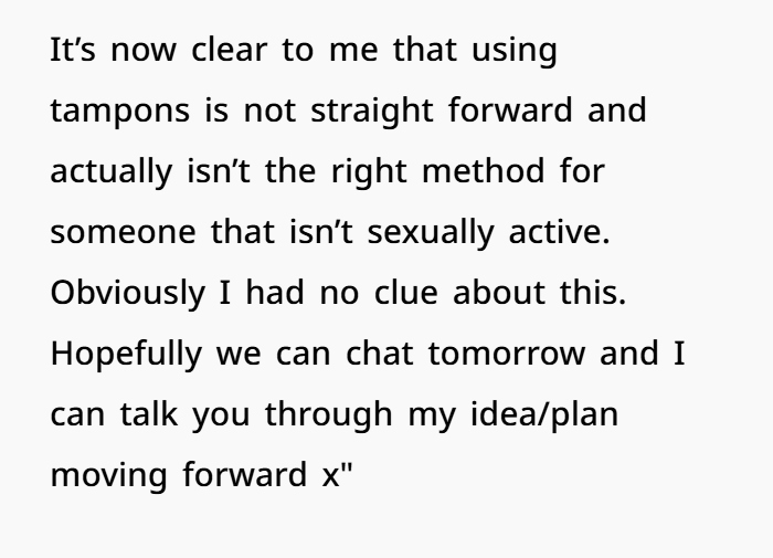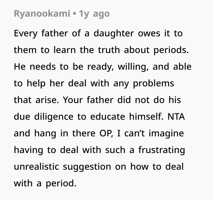 Let’s give the dad a little grace. He wasn’t trying to be mean. He was misinformed. He reached out to “female friends” (probably his girlfriend), and got some terrible advice. In his head, he was trying to find a solution so his daughter wouldn’t “miss out.” The problem is — he didn’t listen to her.