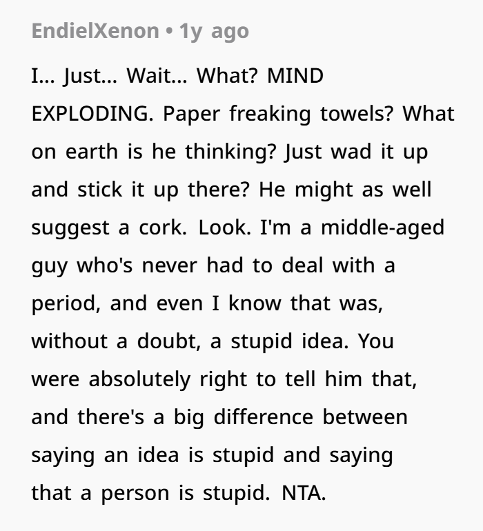 This is a classic example of male well-meaning ignorance. Instead of just saying, “Hey, I don’t understand periods — can you tell me what you need?”, he went the “here’s a solution you didn’t ask for” route. Which is a great way to make someone feel dismissed, especially when they’re already uncomfortable.