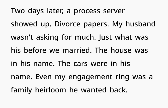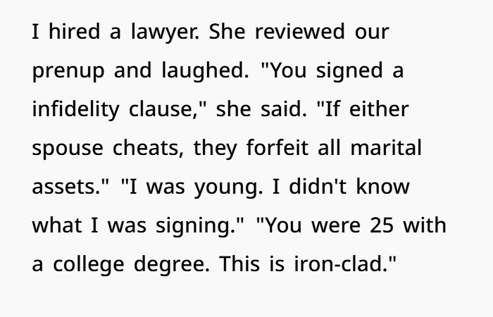 According to top divorce attorneys, infidelity clauses are becoming more common in high-asset marriages. They’re basically legal insurance against betrayal. And in this case, it worked. Her husband walked away with everything—the house, cars, even the engagement ring (which was a family heirloom). She walked away with nothing.