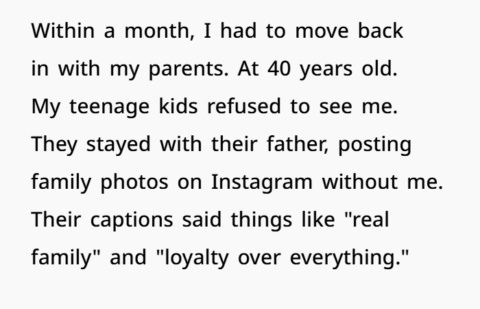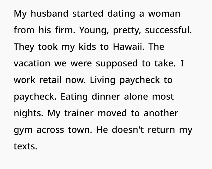 Her husband moved on. Found someone new. Took the kids to Hawaii. Got engaged. Meanwhile, she’s working retail, eating alone, and scrolling through Instagram watching her old life from the outside.