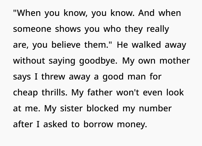 That hurts. But it also says a lot about consequences. Sometimes, it’s not about punishment. It’s just that people move on from pain. And if they heal better without you, well… that says it all.
