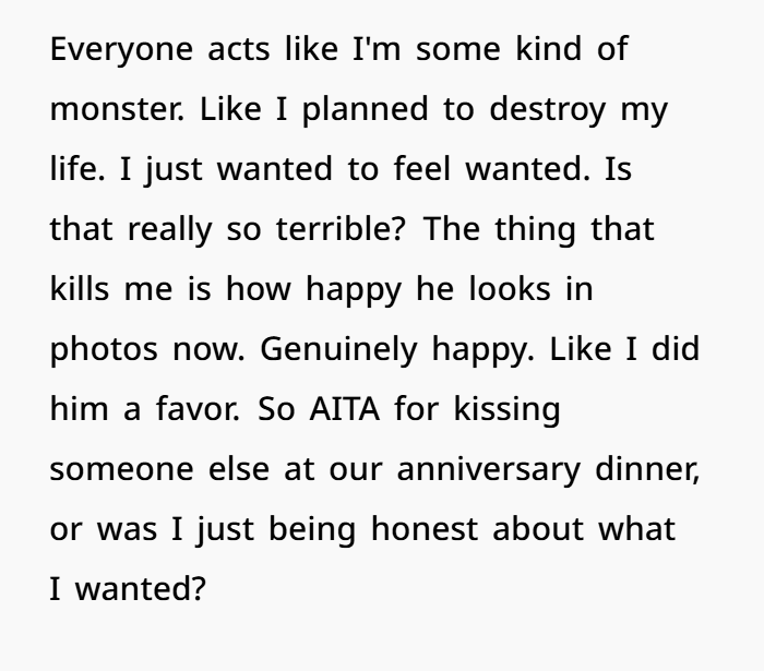 Still… yeah. She’s the asshole here. Not for being unhappy—but for how she handled it. She destroyed trust, humiliated her husband, and blew up her family. And now she’s paying the price.