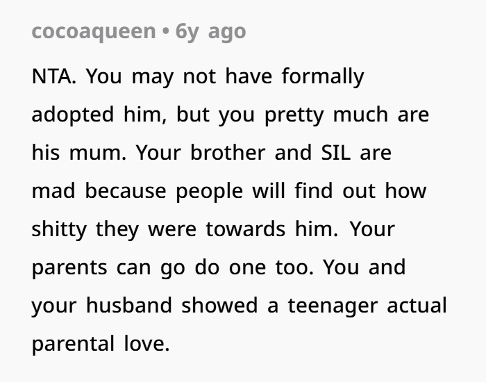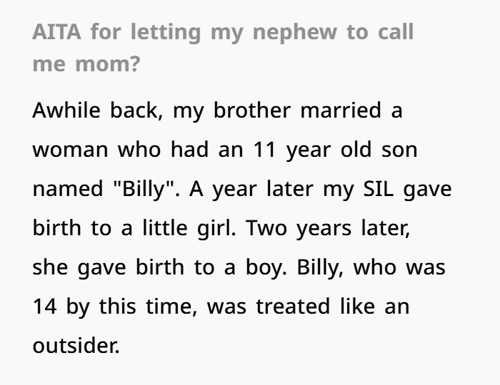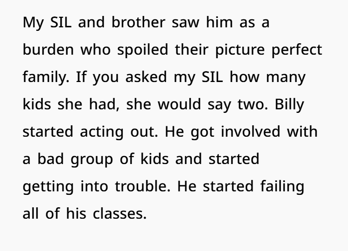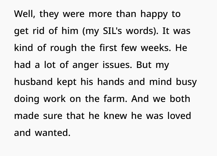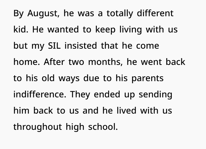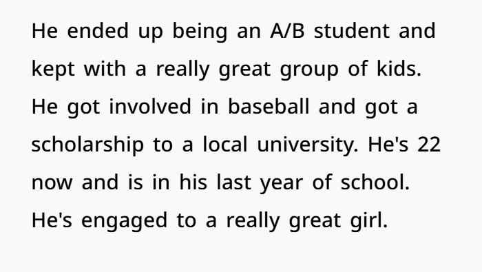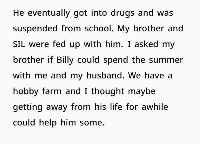 This AITA situation hits deep emotionally. A woman’s nephew, Billy, was treated like an outsider by his own parents. They saw him as a problem, not a kid needing support. After years of neglect, behavioral issues, and danger, the aunt and her husband stepped in. They offered to let him stay on their farm one summer — and it changed his life. From anger and trouble to an A/B student with a baseball scholarship, Billy grew into a stable, thriving adult thanks to the care and love he found with them.