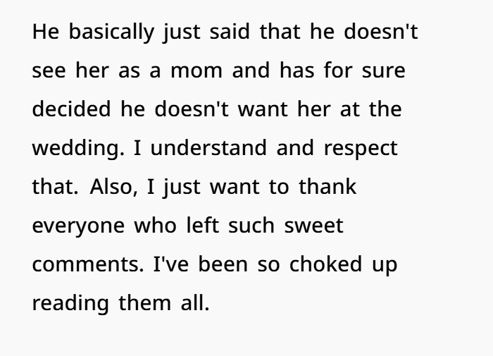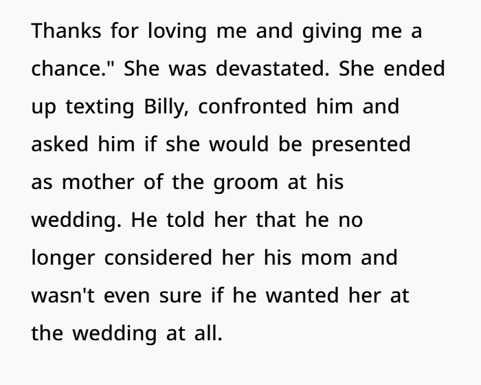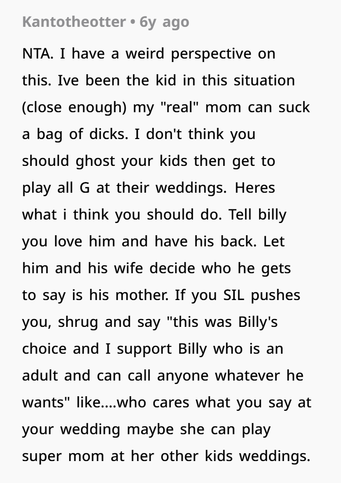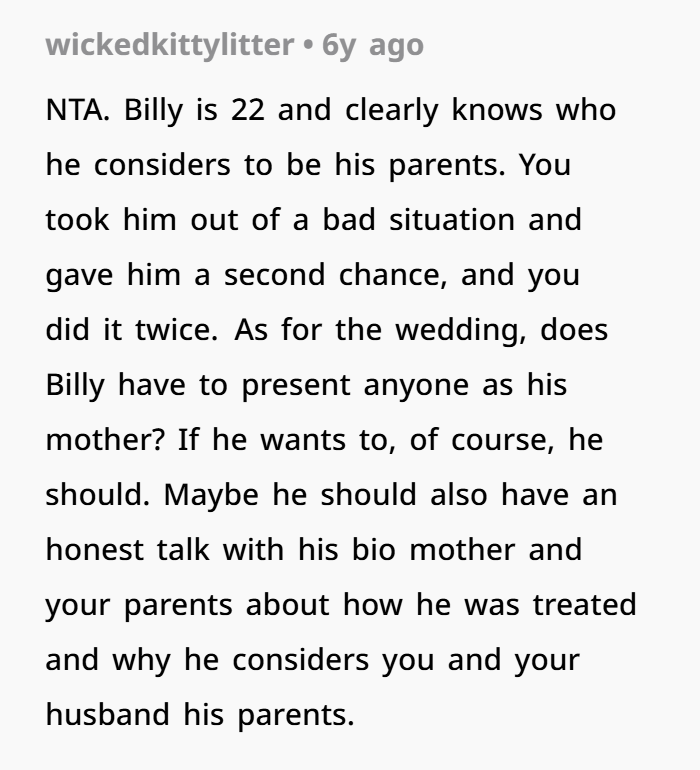 Along the way, he began calling his aunt “Mom” and her husband “Pops.” It wasn’t a title taken lightly — it came from real emotional attachment and healing. Now 22 and engaged, Billy’s bio mom wants to be recognized as his mother at the wedding. But the bond he’s formed with his aunt is so strong that he doesn’t even want his real mom there. The aunt refuses to tell him to stop calling her “Mom,” even under family pressure. So the question stands: AITA for not respecting his mom’s request?