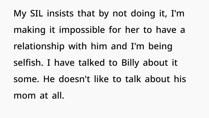 So the family is pressuring your aunt to tell Billy not to call her “Mom.” They frame it as making space for his mom or restoring peace.