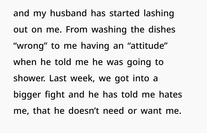 Your husband’s behavior — from yelling about dishes and “attitude” to saying he hates you — isn’t okay. When you pulled back, things actually fell apart on his end. He’s suddenly unable to manage the basics he used to rely on you for. You’re not “lazy” or “spoiled.” You’re a mom trying to juggle work, household duties, childcare, and emotional labor — all without support or an apology from your partner.