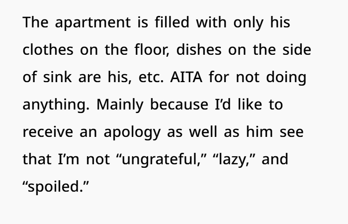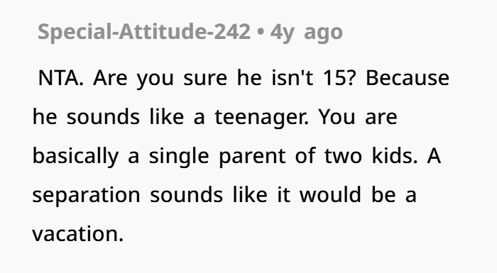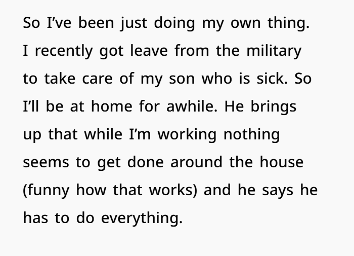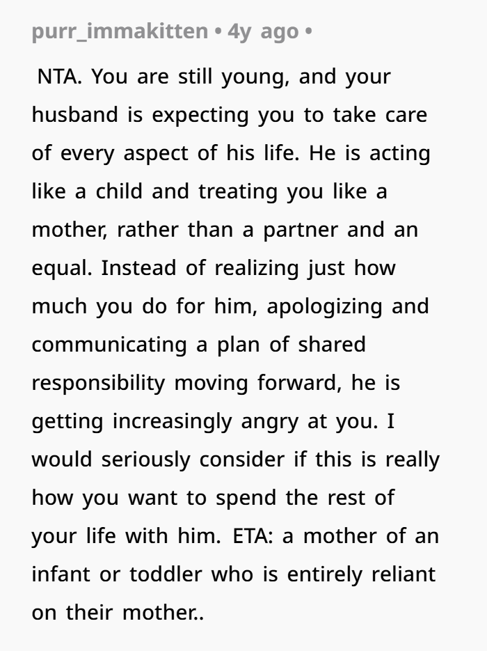 When you stopped doing everything for him? His world tilted because he was dependent on you for those tasks. That’s not your fault. That’s an imbalance that should have been addressed with communication, not criticism.