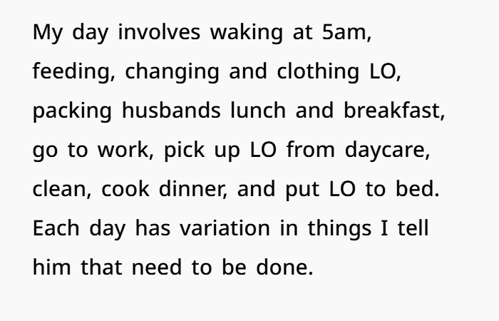 The poster was a working mom who also took care of her toddler and managed household chores, while her husband just complained