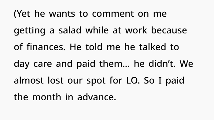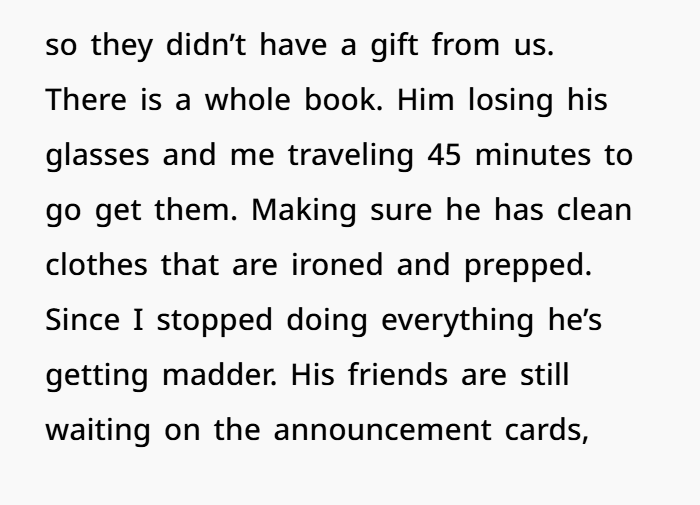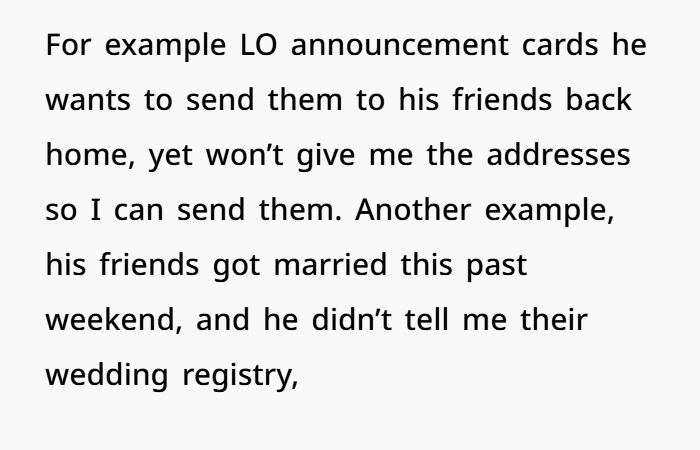 Also — daycare confirmations, announcement cards, gift registries — these sound like miscommunications, not sabotage. But repeatedly saying he doesn’t give you info and then blaming you when plans fail? That’s not teamwork.