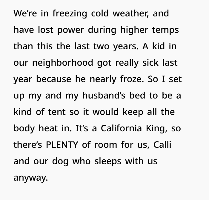 First, let’s talk about the core issue that started the argument: protecting a child during extreme weather conditions. In many parts of Texas, winter storms and sudden power outages have become a serious concern since the 2021 Texas power grid crisis. During that event, millions of homes lost electricity in freezing temperatures, and multiple reports documented cases of hypothermia, carbon monoxide poisoning from unsafe heating attempts, and medical emergencies. Parents in affected areas became much more cautious afterward. Many emergency preparedness guides — including those from the Federal Emergency Management Agency (FEMA) and Texas emergency management offices — specifically recommend families stay in one room and share body heat if heating systems fail.