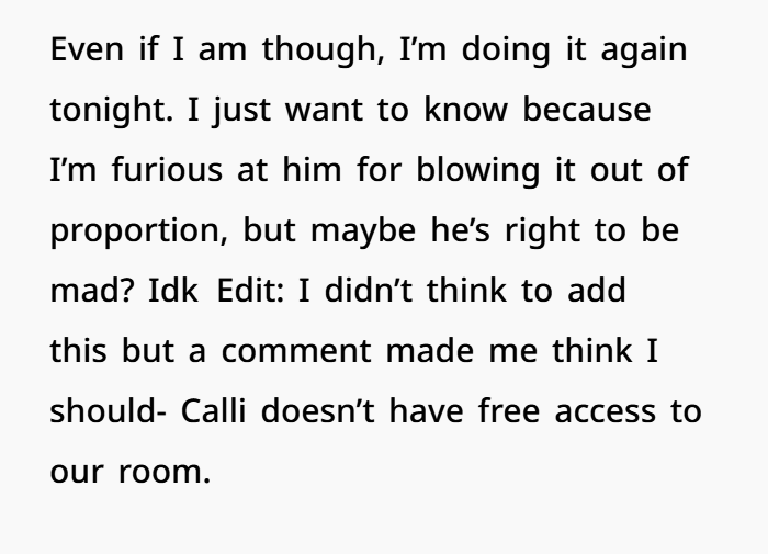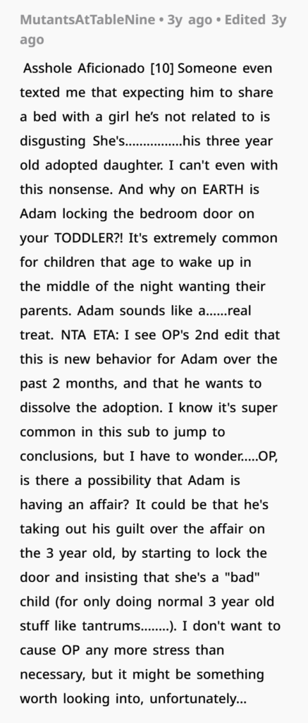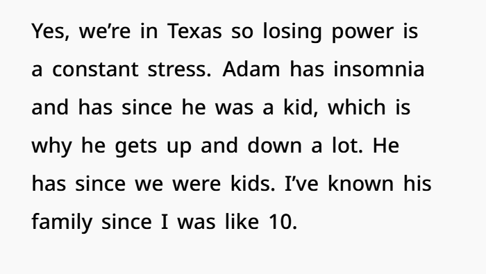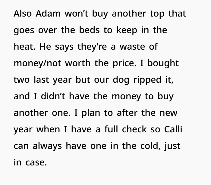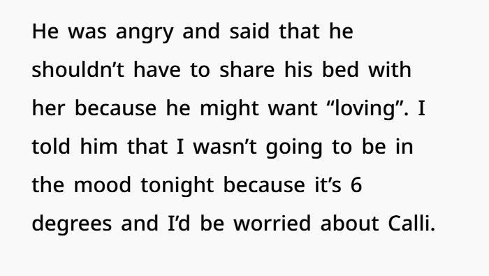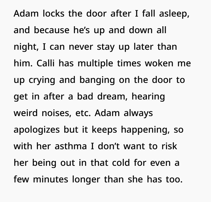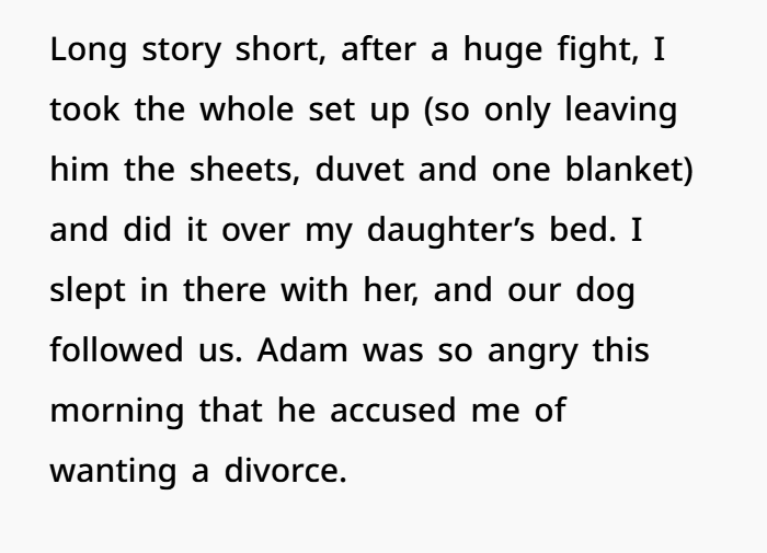 But what she thought was a practical parenting decision quickly turned into a major relationship conflict. Adam became upset when he saw Calli in their bed, arguing he didn’t want to share his sleeping space because he might want intimacy later. The conversation escalated into a heated argument. Eventually the mom moved the whole warm setup into Calli’s small bed and slept there with her daughter instead, leaving Adam alone in their room. By morning, things had spiraled even further. Adam accused her of wanting a divorce, his family began texting accusations, and someone even suggested it was inappropriate for him to share a bed with a child he isn’t biologically related to—despite the fact that he legally adopted her.