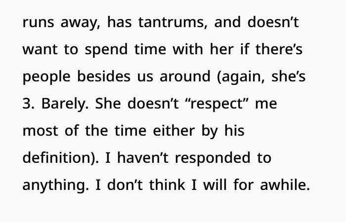 Finally, the broader emotional context matters too. Parenting a three-year-old is chaotic by nature. Toddlers are still developing emotional regulation and frequently test boundaries. Tantrums, running away during play, refusing to listen, or “talking back” are all normal behaviors at that age. Developmental psychologists emphasize that expecting consistent “respect” from a toddler misunderstands how young children process rules and authority. They’re learning, experimenting, and reacting emotionally — not intentionally disrespecting adults.
