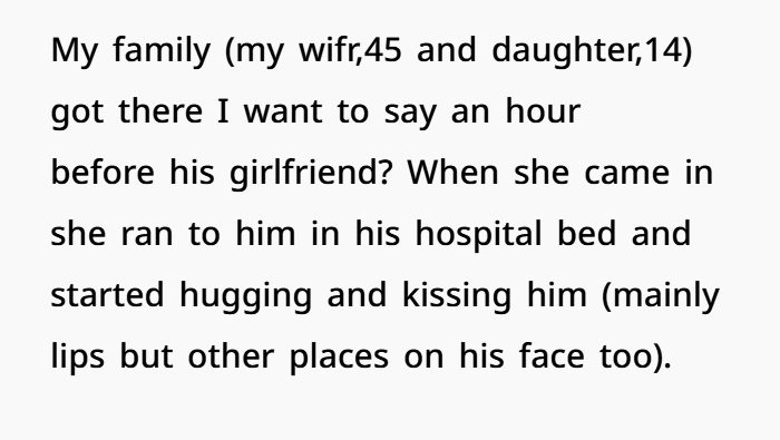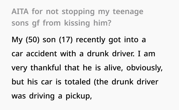 This story centers around a father dealing with a tough situation after his 17-year-old son survives a serious car accident caused by a drunk driver. The boy is badly injured—broken bones, stitches, and a totaled car—but thankfully alive. While the family gathers at the hospital, emotions are high, and everyone is focused on his recovery. Then his girlfriend arrives, clearly shaken but deeply caring. She rushes to his bedside, hugging and kissing him, trying to comfort him in the only way she knows how. To the father, this feels natural and even reassuring—his son is loved, supported, and not alone in a scary moment.