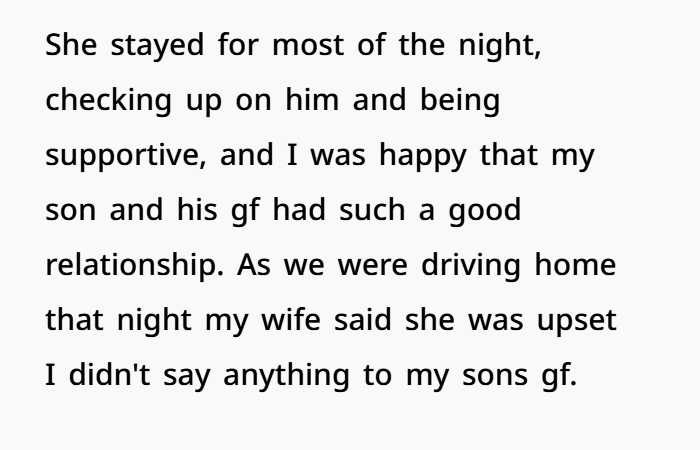 If the father had stepped in and told the girlfriend to stop or leave, especially in that moment, it could’ve had unintended consequences. For one, it might’ve caused emotional distress to his son, who was already in pain and vulnerable. It could also strain the son’s relationship with both parents, making him feel controlled or misunderstood.