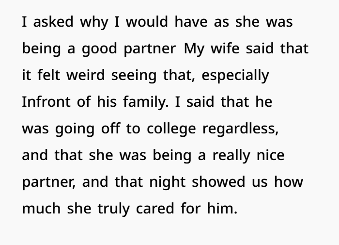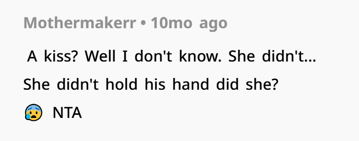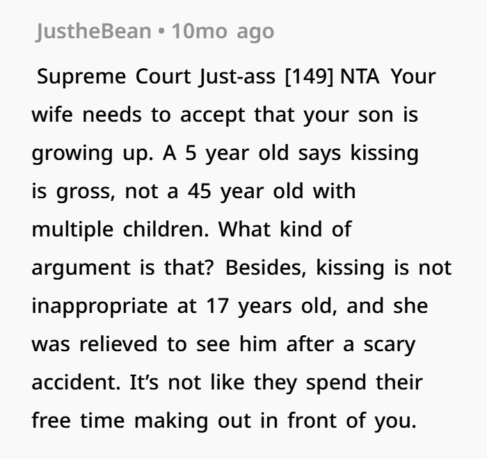 But things take a turn later that night. On the drive home, the mother expresses discomfort with what she saw. She felt the girlfriend’s behavior—especially the kissing—was inappropriate in front of family. The father disagrees, seeing it as harmless affection during a crisis. What follows is a tense disagreement about boundaries, parenting roles, and what’s “appropriate” when emotions are running high. Now the father is second-guessing himself, wondering if he should’ve stepped in or if he did the right thing by letting his son receive comfort during a painful moment.