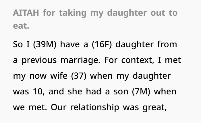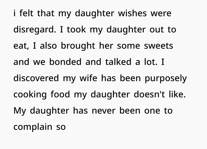 You stepping in and taking your daughter out to eat wasn’t just about food — it was sending a message: “Your feelings matter. I believe you. You’re not being childish.” That was powerful. You still escalated by doing something without mutual agreement, and your wife feels undermined. But in that moment, your priority was your daughter’s well‑being.