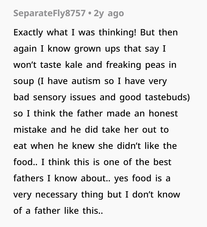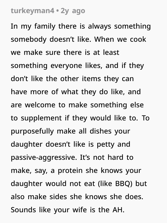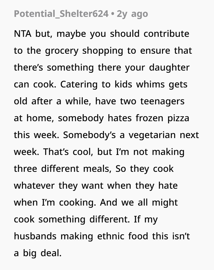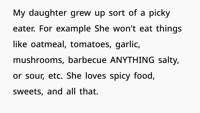 There are a few layers here: the relationship dynamics in a blended family, the limits of accommodating extreme pickiness, and the tension between honoring a child’s comfort and wanting family meals to unify. It feels messy, because both sides have valid hurts. But some lines were crossed.
