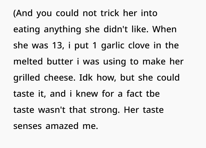 Your daughter’s pickiness is not typical finicky behavior — it’s deeply ingrained. The garlic‑in‑butter trick backfired, and even very mild flavors or textures evidently hit her strongly. Many people with sensory sensitivities, texture aversions, or even conditions like ARFID (Avoidant/Restrictive Food Intake Disorder) experience extreme aversions that aren’t just “being picky.” So it’s not fair to treat it lightly.