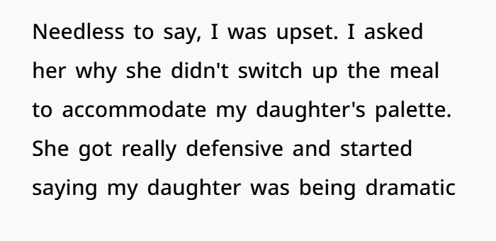 When you asked why your wife didn’t adjust the meal, she got defensive and said your daughter “was being dramatic.” That response implies she views your daughter’s preferences as unreasonable, rather than real. That dismissiveness sets up a conflict: one person’s valid boundaries get labeled “drama,” which is demeaning.