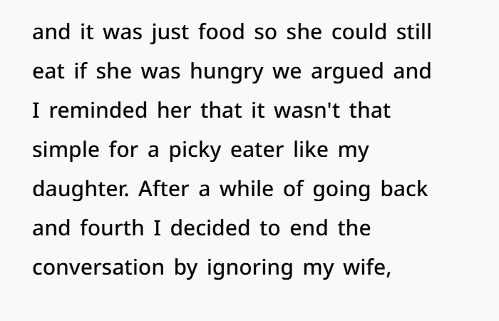 I (39M) have a 16‑year‑old daughter from a prior marriage. I also have a younger stepson (7) with my current wife (37). My daughter has always been extremely picky: no tomatoes, no garlic, no barbecue stuff, no sour or salty foods, etc. One night I got home to find my wife had made a dinner full of things my daughter absolutely won’t eat. When I asked what my daughter would eat, my wife admitted she hadn’t eaten anything since lunch. The two of them argued—my wife saying it’s “just food,” me saying she’s ignoring my daughter’s boundaries—and eventually I took my daughter out to eat, gave her sweets, and we bonded. But now my wife is furious that I “undermined” her cooking. AITAH?