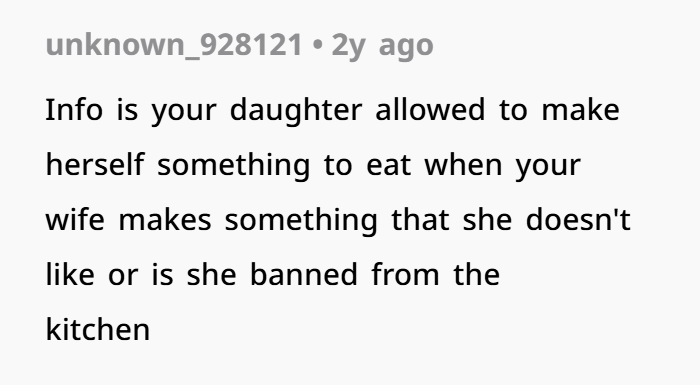 But this cannot become your regular pattern: “When she messes up, I swoop in.” That breeds division. To avoid that, you and your wife need a new system: respect, communication, and structured boundaries around food. A shared plan. A buffer for your daughter that doesn’t feel like always catering to her, but also doesn’t feel like she’s starving for emotional validation.