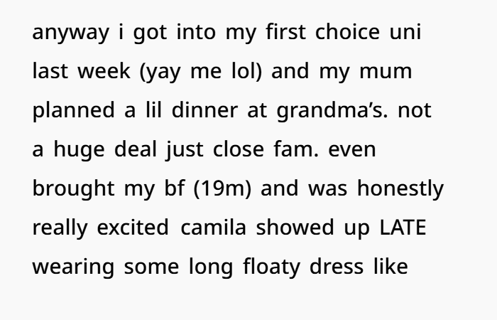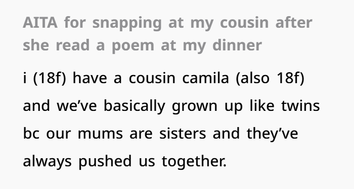 I’ve spent my life watching my cousin, Camila, always being the “star” while I stayed in the shadows. Tonight was supposed to be different — my little celebration, my night. But she still found a way to hijack it. I snapped, called her out on her pattern, and now the whole family’s in chaos. Am I the bad guy here?